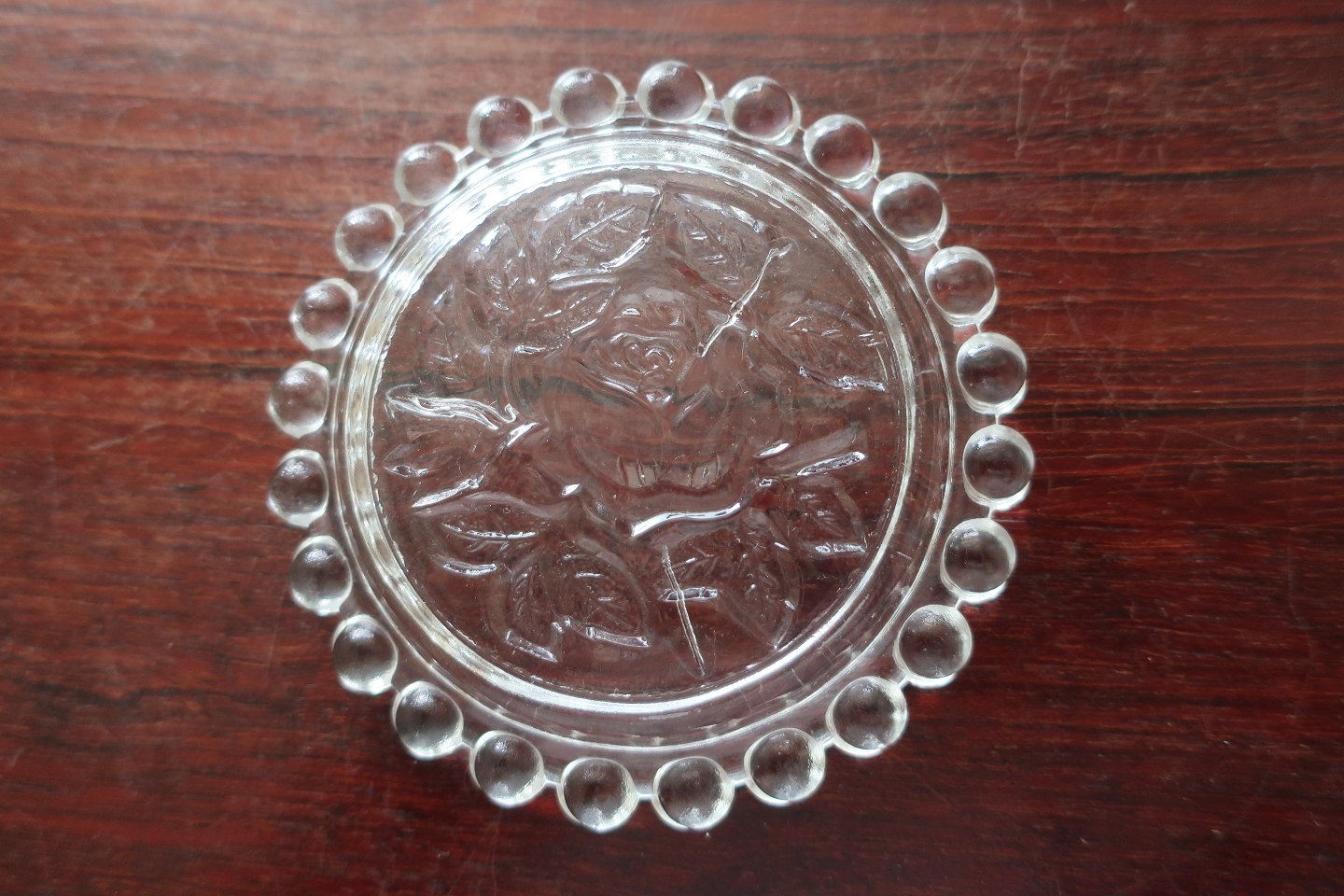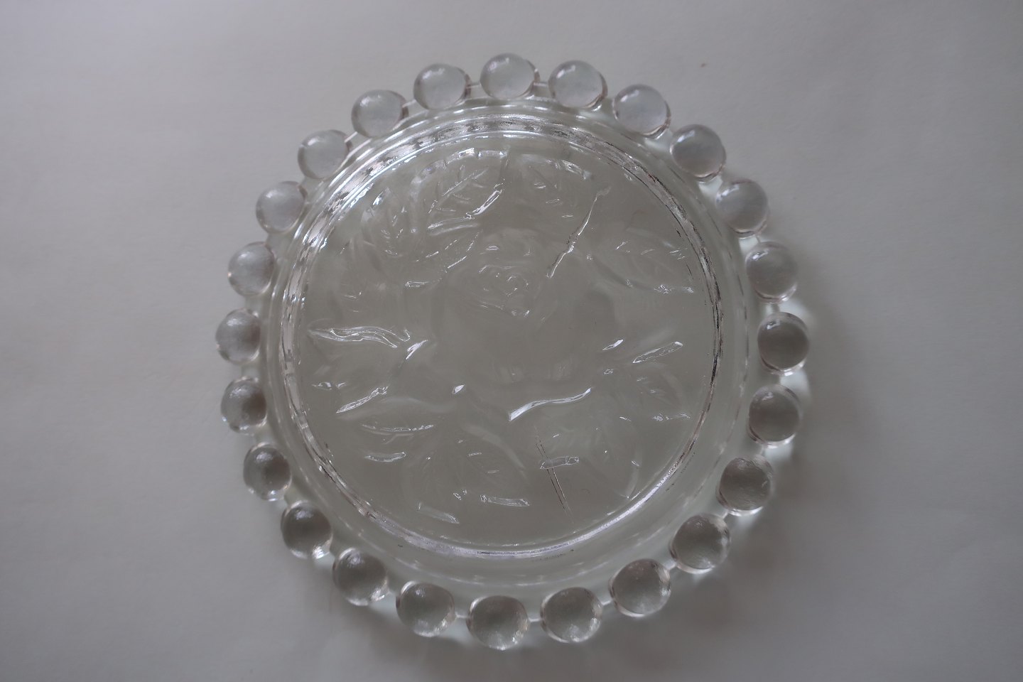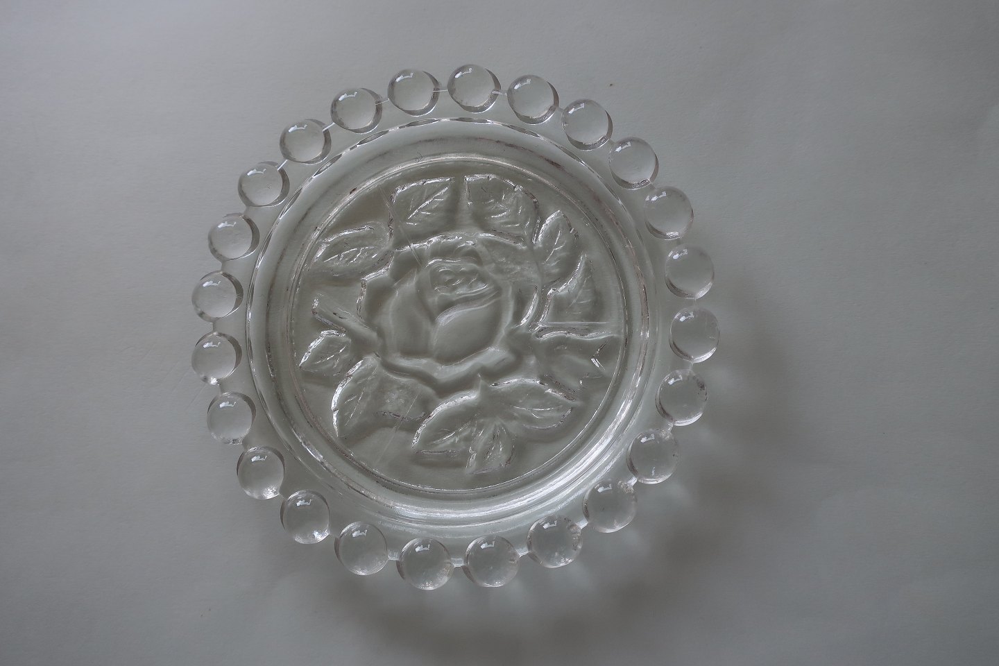 Gamle flaskebakker af glas Med perlekant i glas Rose som bundmotiv Diam: 10,5cm Fra 1930'erne Sælges som sæt á 2 stk. God stand Varenr.: KM1006