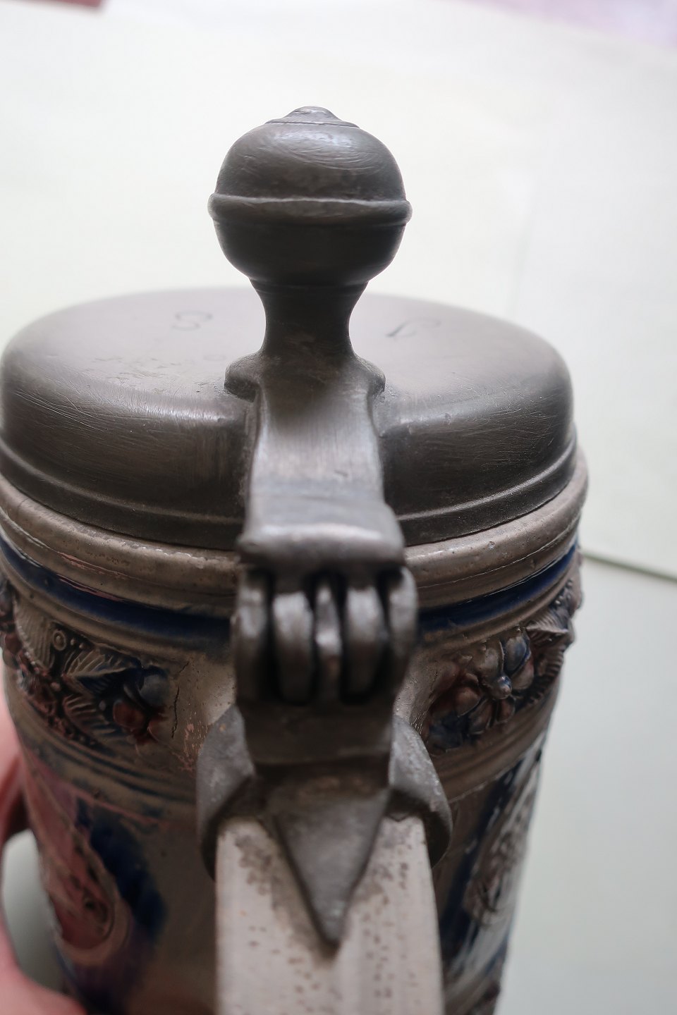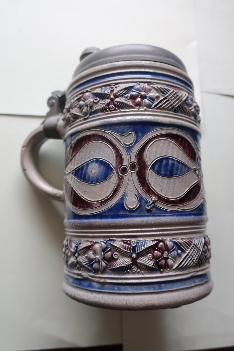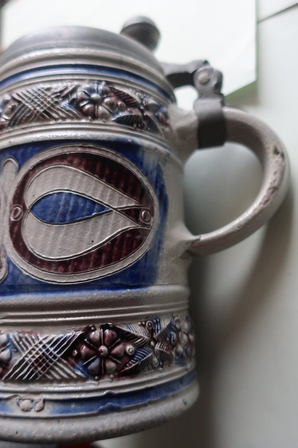 Antik Krug mit Deckel aus Zinn Keramik H: 17cm MIt Stempel In sehr gutem Zustand Warennr.: KH1006